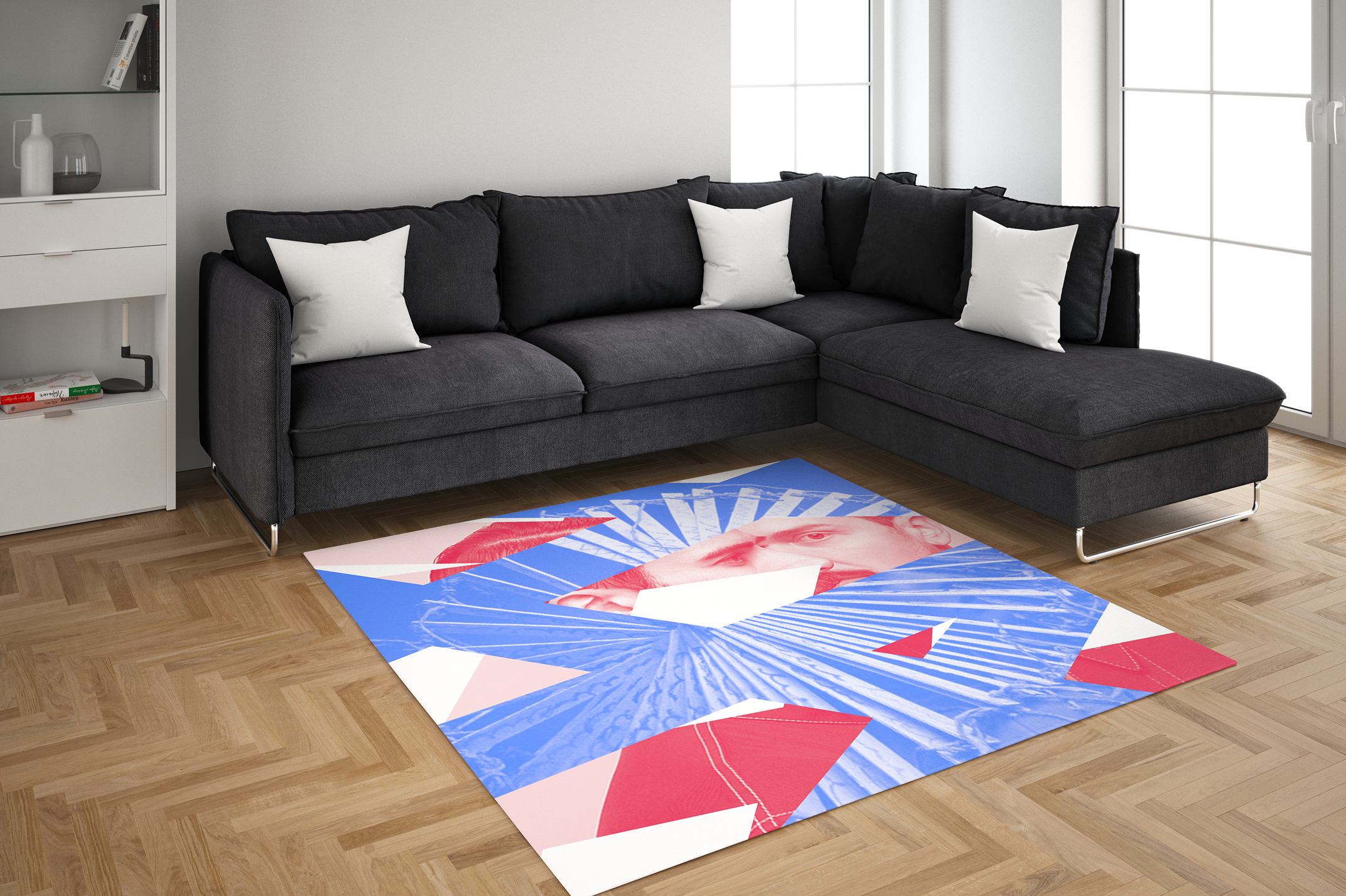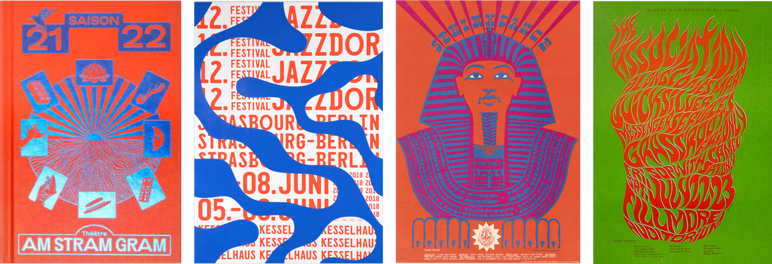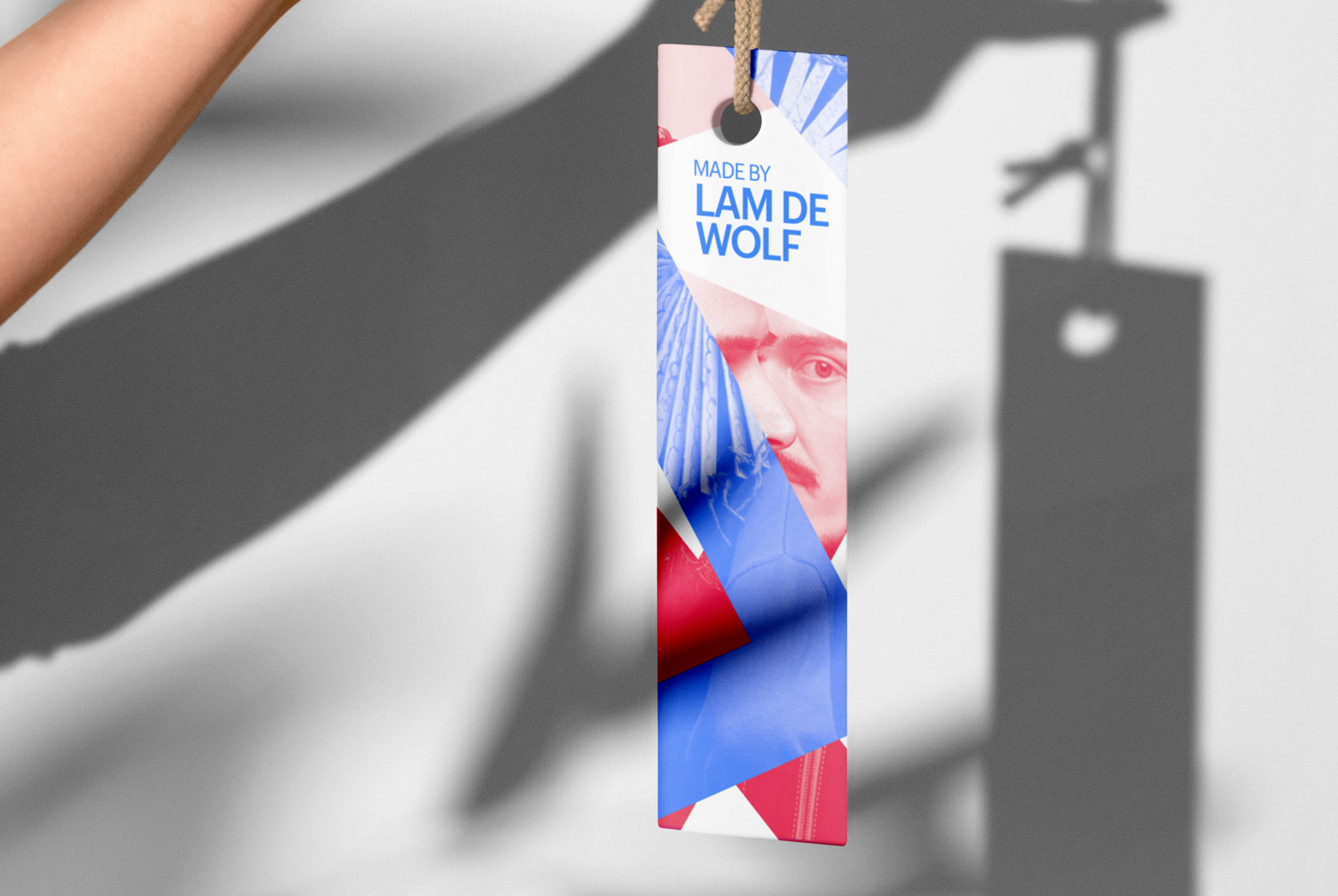 A highly saturated tertiary red and blue are used due to their high contrast, which creates a vibrating effect when placed on one another. This establishes the bold exploration of colour within the exhibition. White is then used for balance.